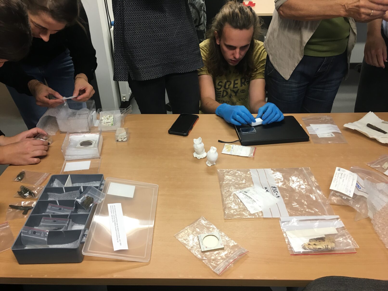 – True Replicas, Fall 2019. Maaike Roozenburg briefing students in the attic of Cultuurhuis Kuiperspoort, the course’s exceptional location for that semester – a hub of arts & crafts in Middelburg. Meeting the objects in real life at Erfgoed Zeeland with archeologist Aagje Feldbrugge and scanning them with the help of TU Delft specialist Yvo van Os.