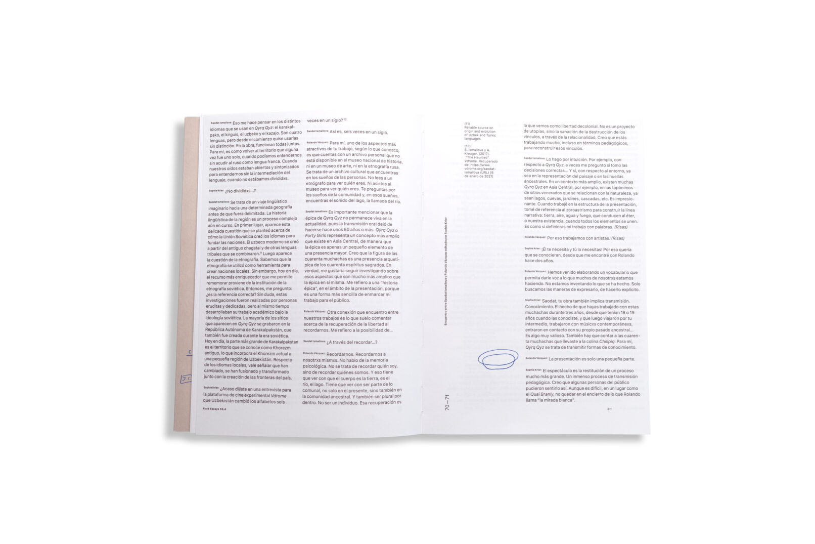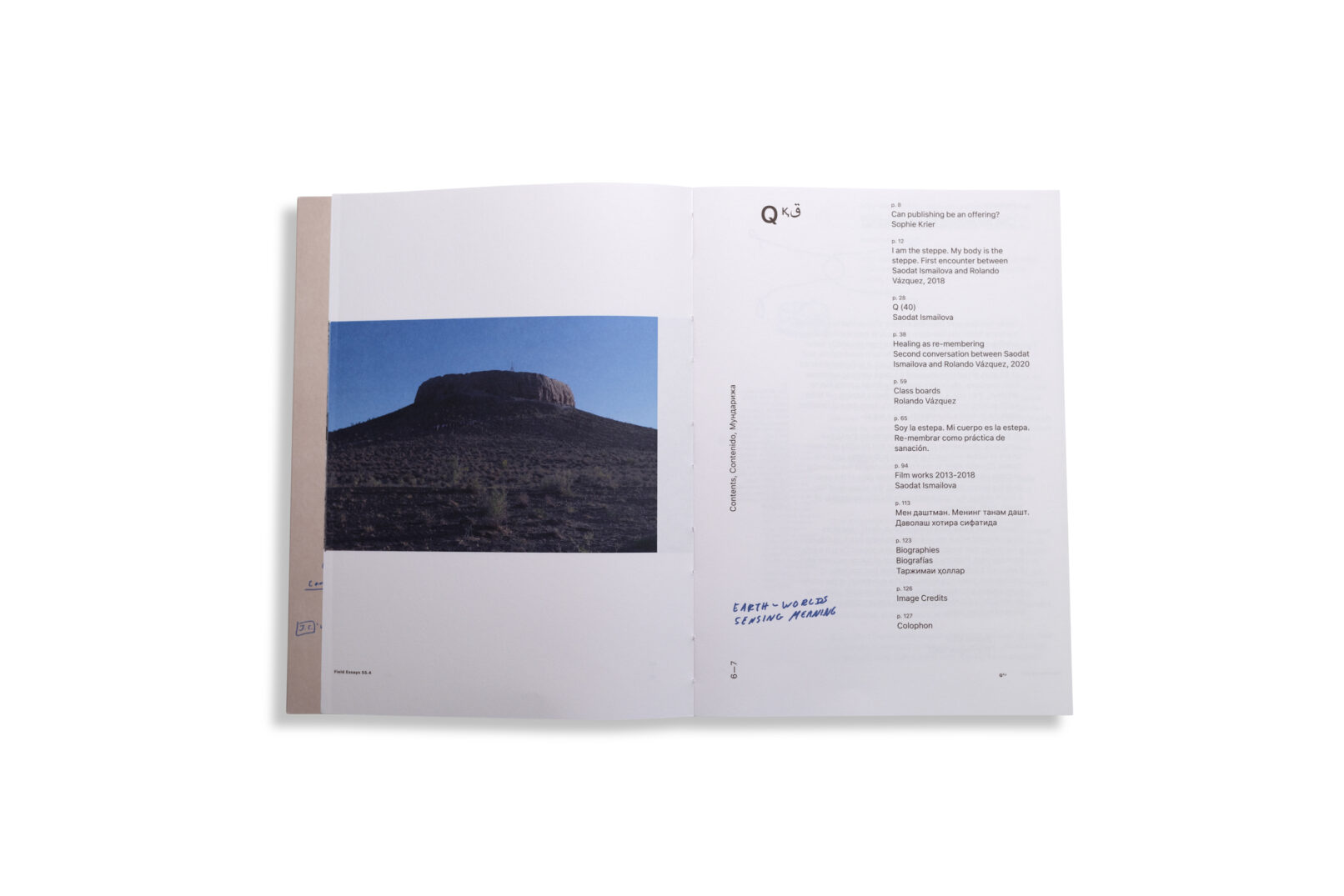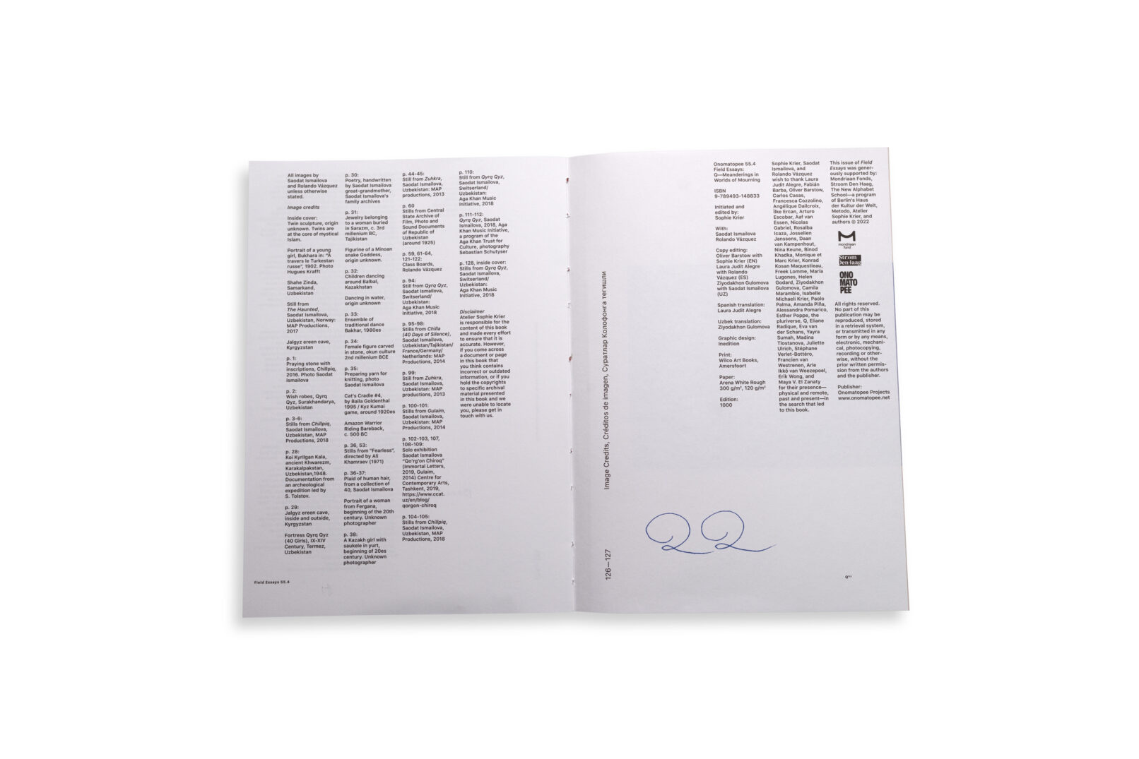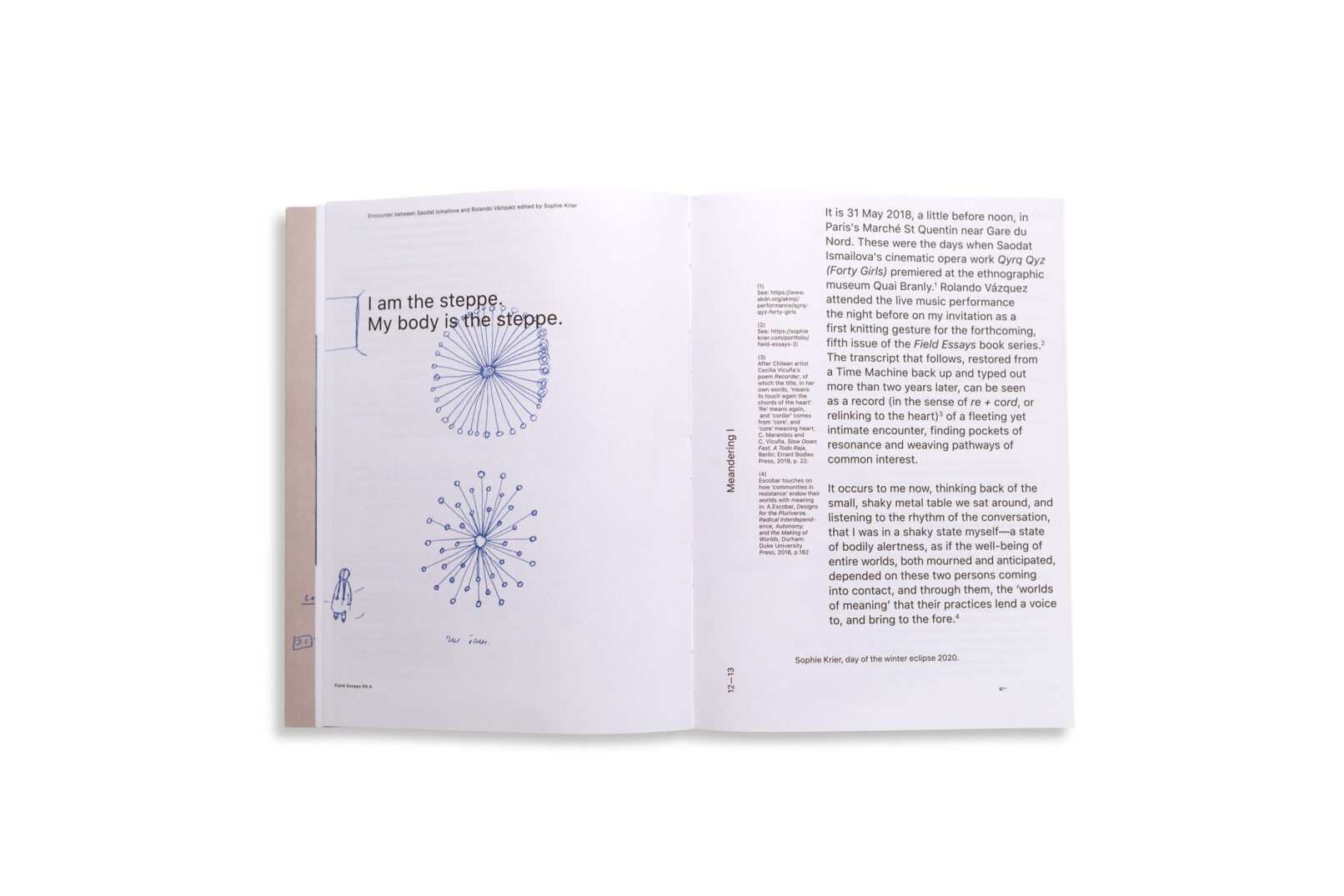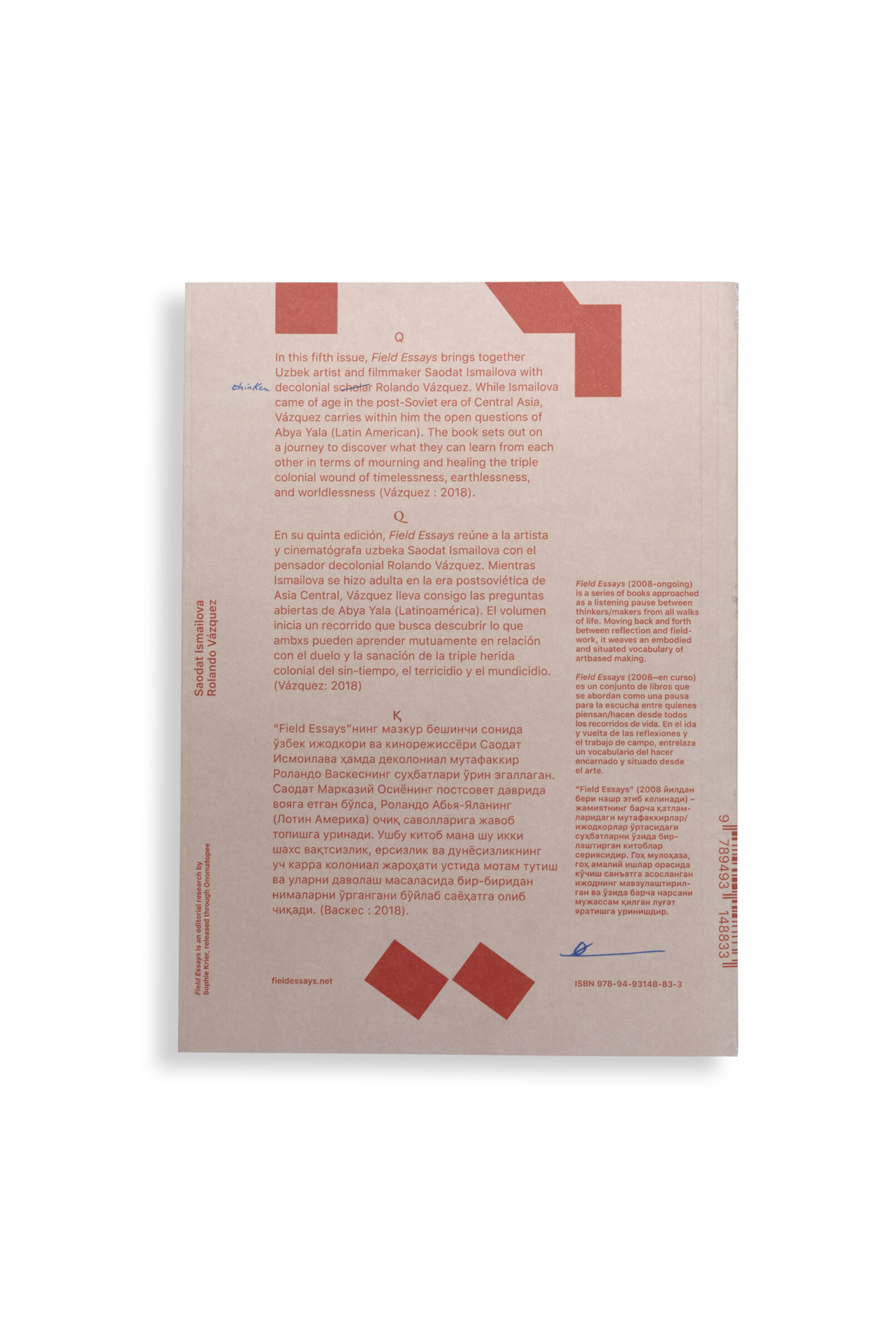 In this 5th issue, Field Essays brings together Uzbek artist and filmmaker Saodat Ismailova with decolonial thinker Rolando Vázquez. While Ismailova came of age in the post-Sovjet era of Central Asia, Vázquez carries within him the open questions of Abya Yala (Latin America). The book sets out on a journey to find out what these differing cultures can learn from each other in terms of mourning and healing the triple colonial wound of timelessness, earthlessness and worldlessness (Vázquez: 2018).