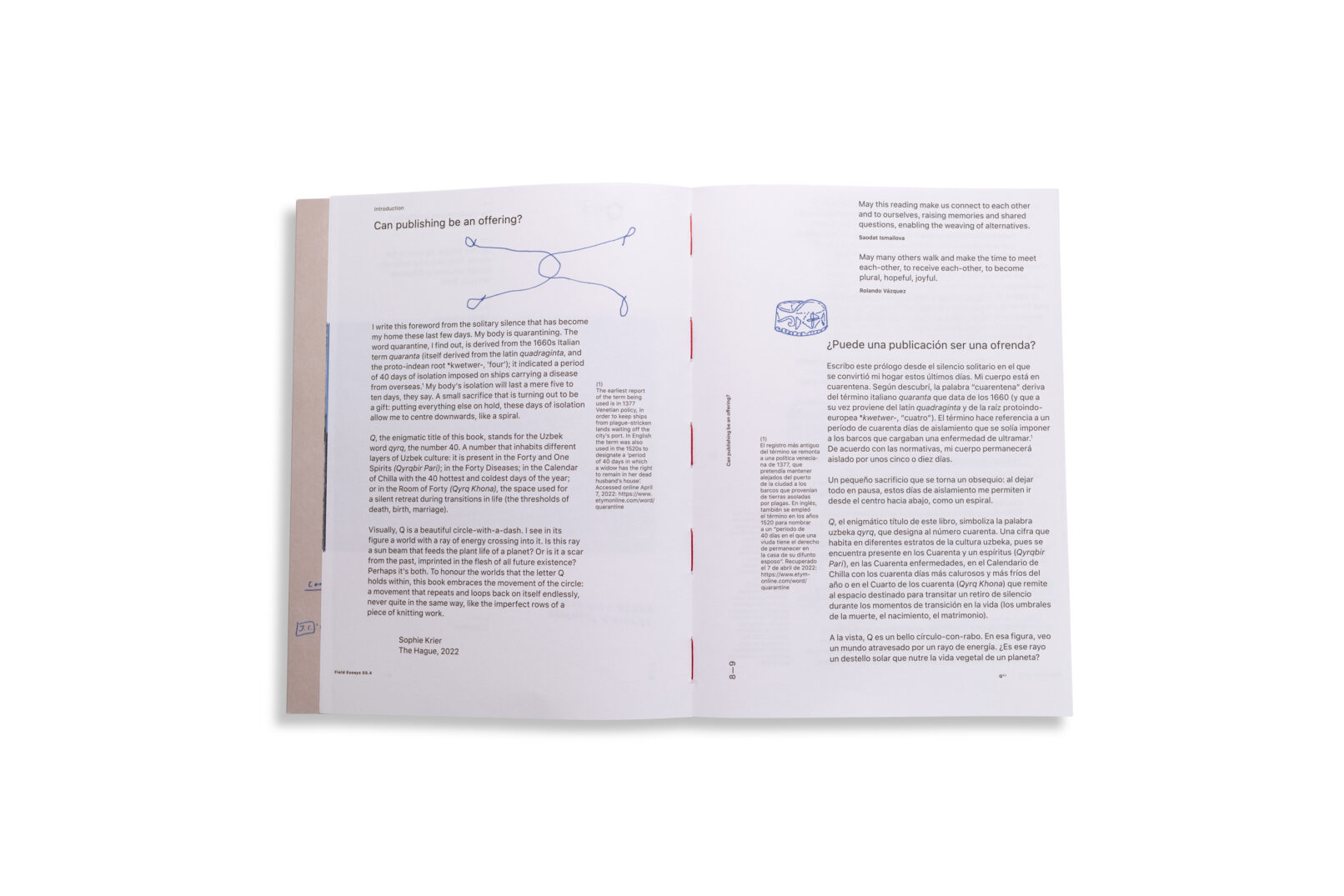 Can a book be a gesture of offering rather than a space of enunciation? Can it be a space of listening that can reconfigure inherited Western modes of thinking and working and create a space of “coming to voice” for silenced histories and life lines? The name given to this book and journey is “Q. Meanderings in worlds of mourning”. Q stands for the Uzbek word qyrq, the number 40, which inhabits different layers of Uzbek culture: it is present in the Forty and One spirits (Qyrqbir Pari); in the Forty Diseases; in the Calendar of Chilla with the 40 hottest and coldest days; and in the Room of Forty (Qyrq Khona), the space used for a silence retreat during transition moments in life (death, birth, mariage).